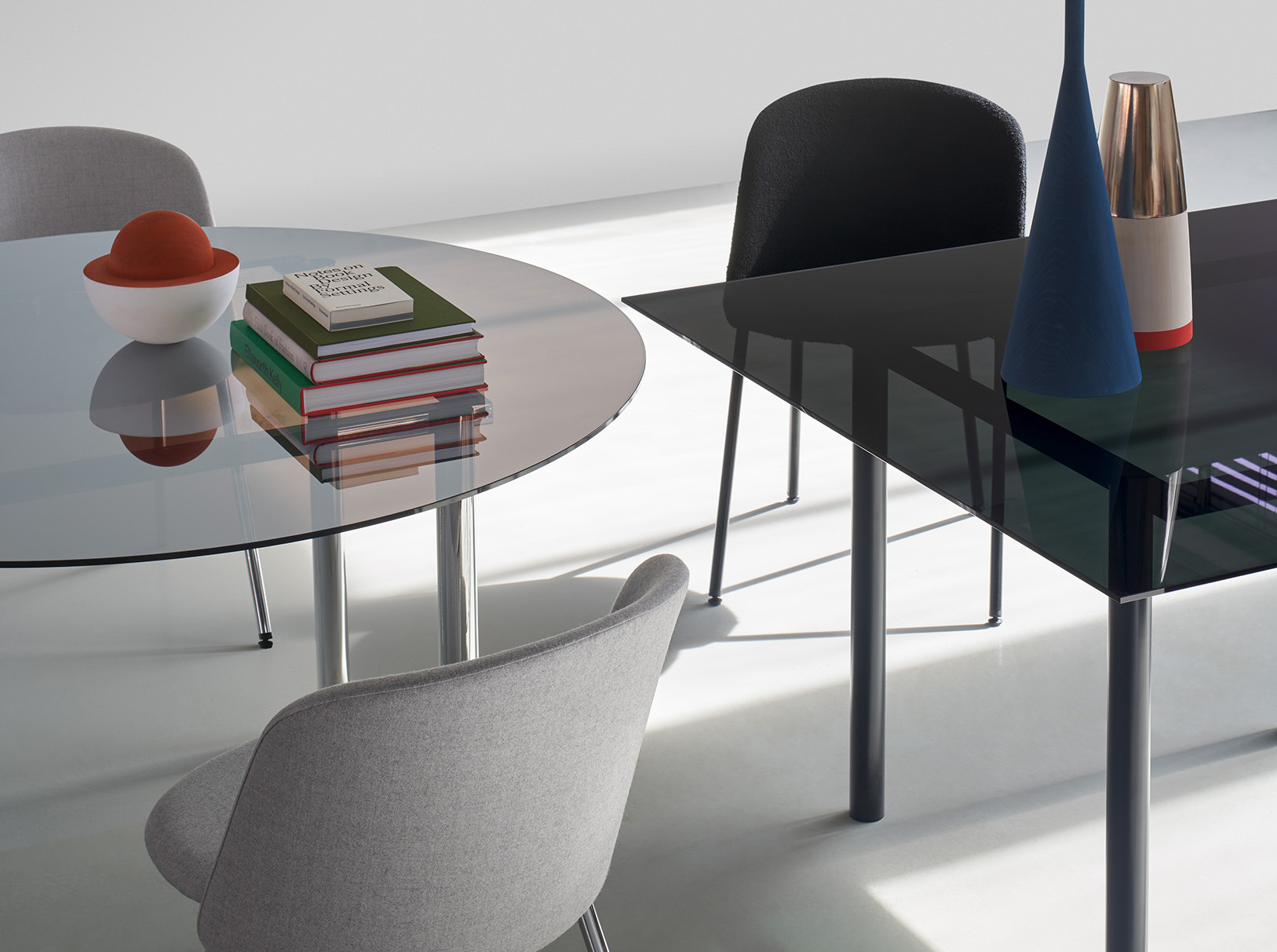 Der runde und quadratische Tisch THEOREM von Philipp Mainzer und Farah Ebrahimi legt spielerisch den Fokus auf industrielle Materialien und elegante Geometrie.